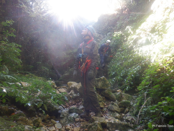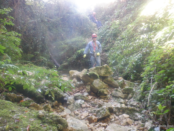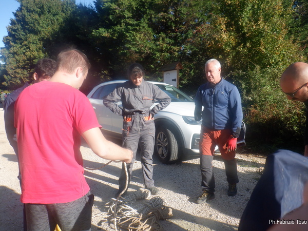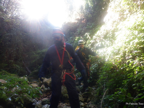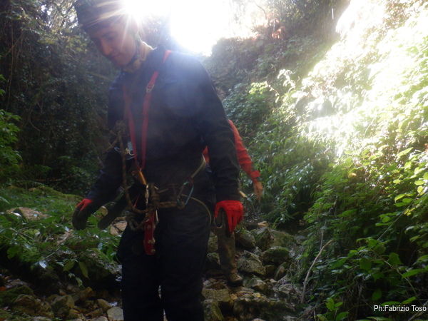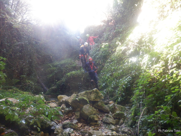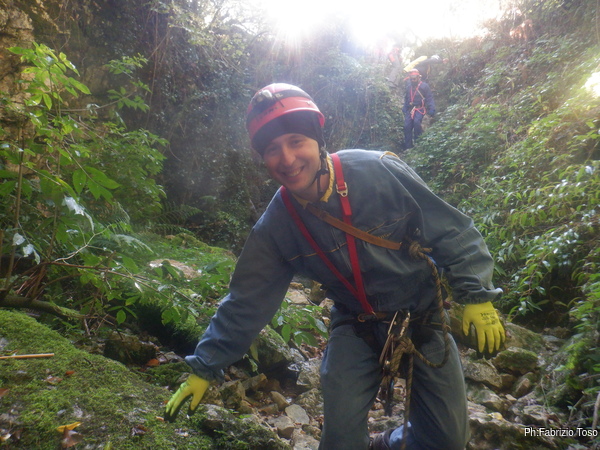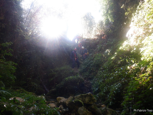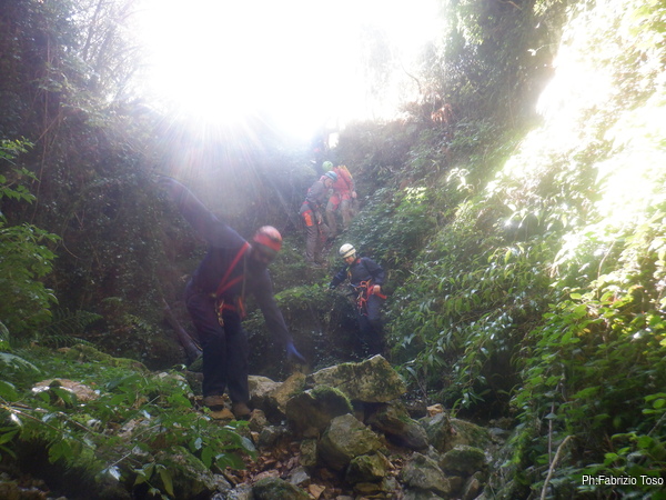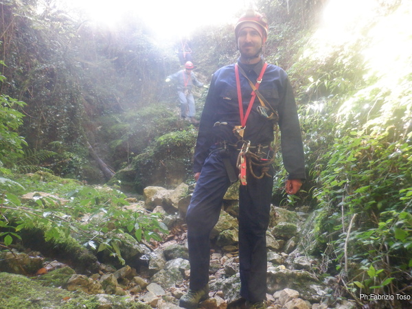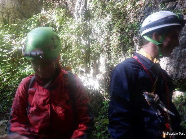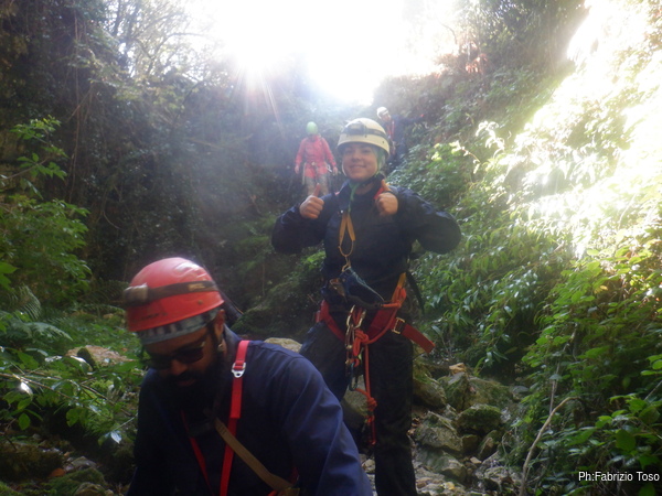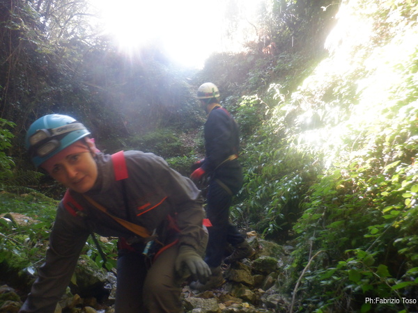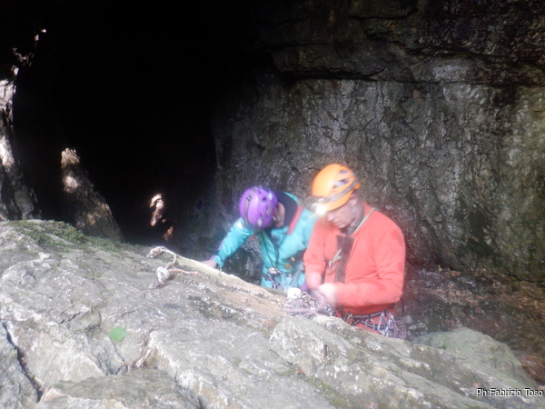 In breve il saltino e’ armato, Max e Alessandro vanno avanti velocemente, io scendo alla base del saltino per fare sicura agli allievi che si apprestano a scendere.