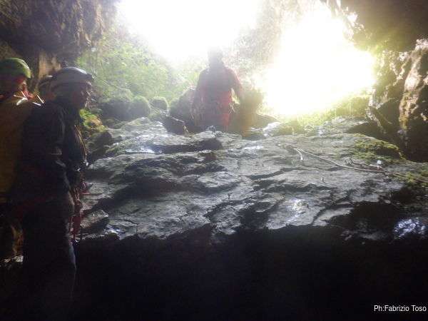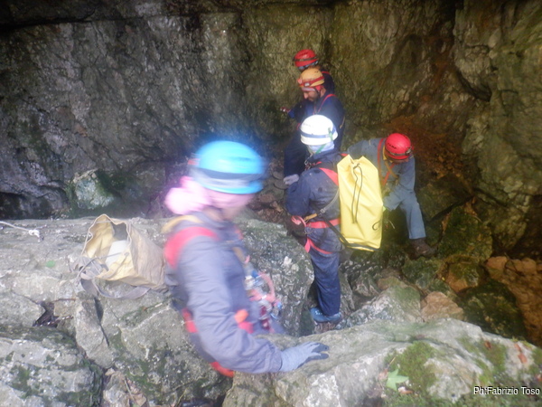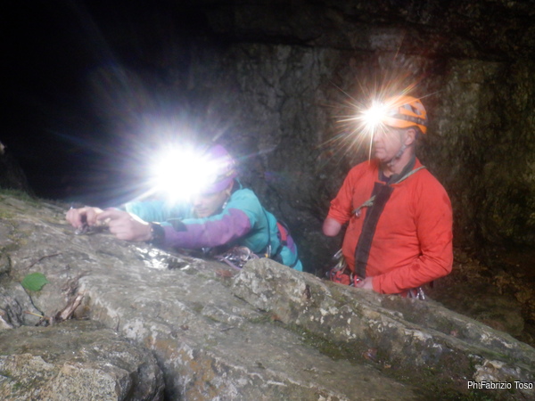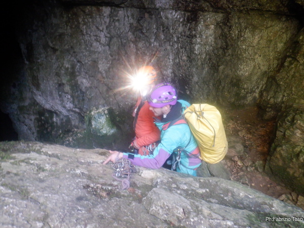 Inizia ufficialmente l’avventura in grotta. Qua c’e’ Patrizia che affronta il saltino.