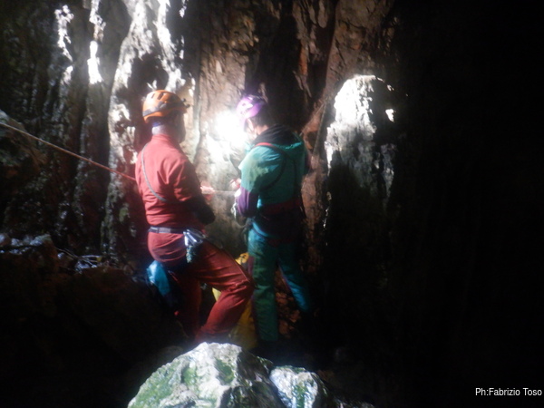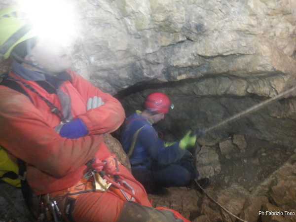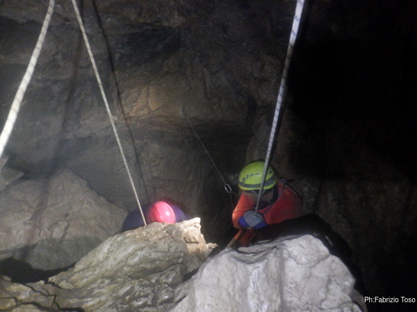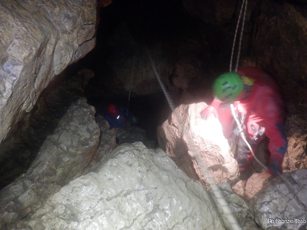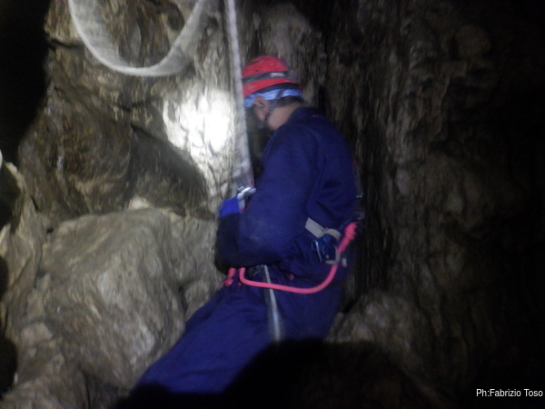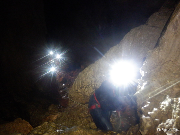 Intanto l’armo del primo saltino procede, lento ma inesorabile.