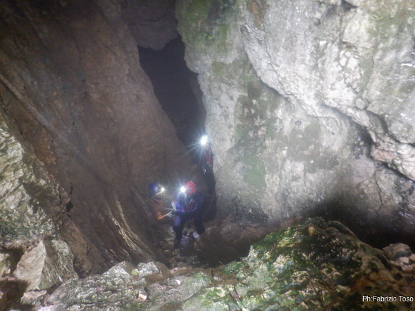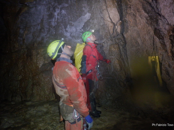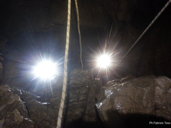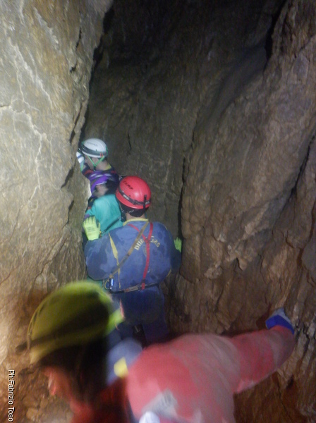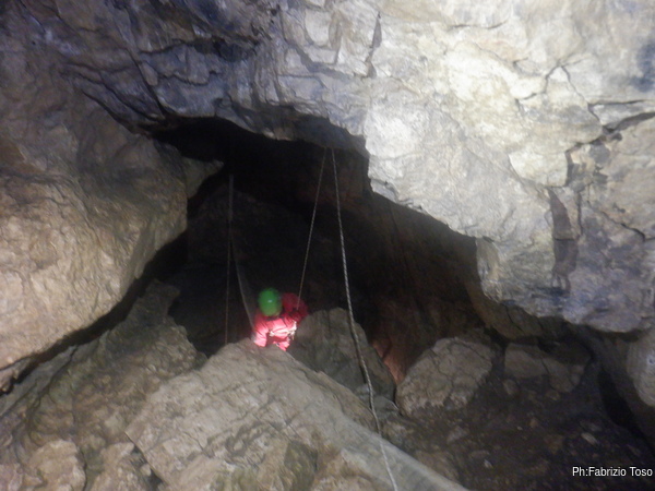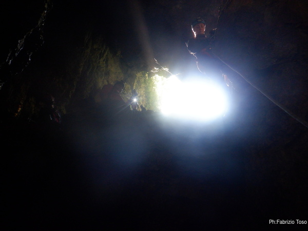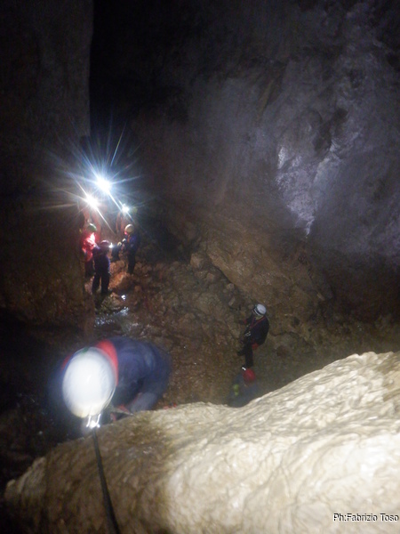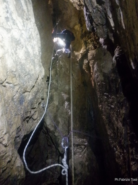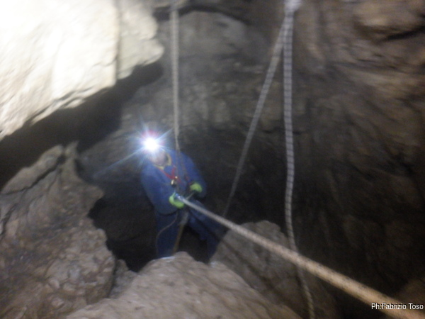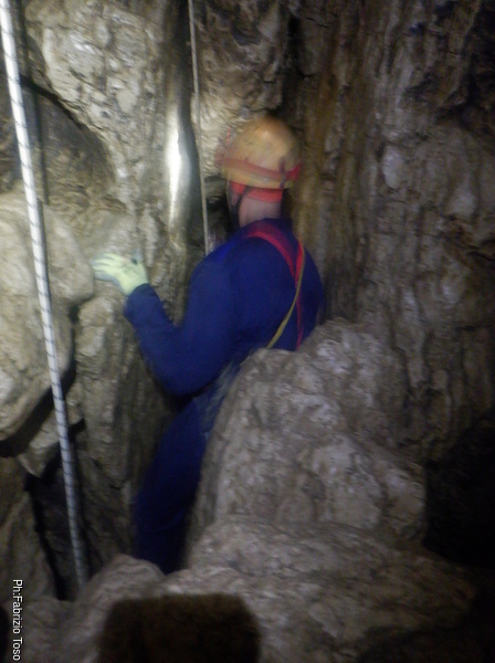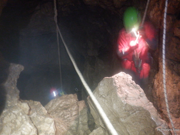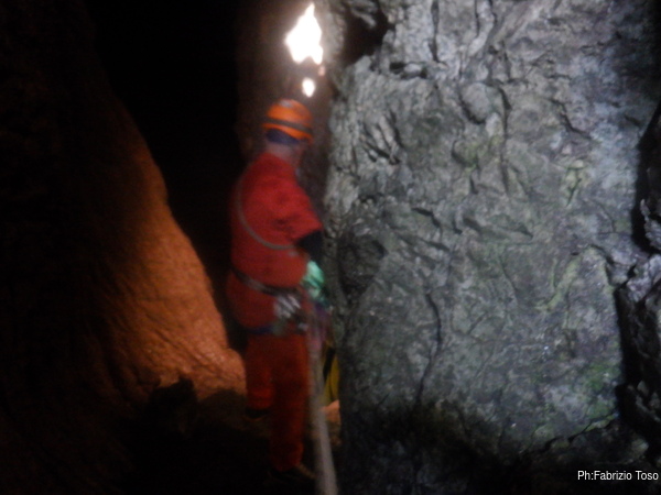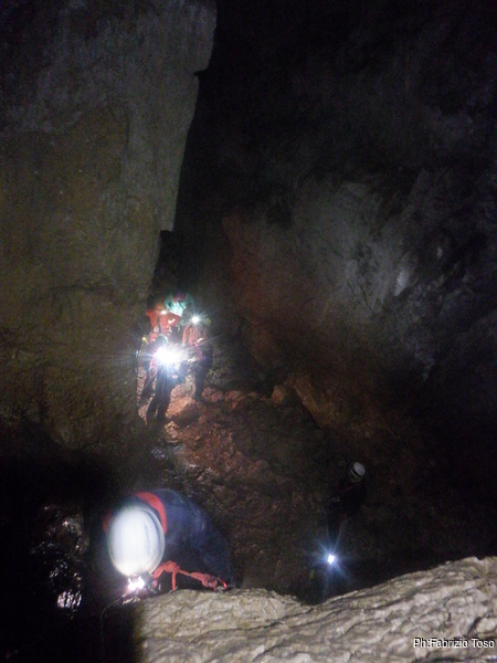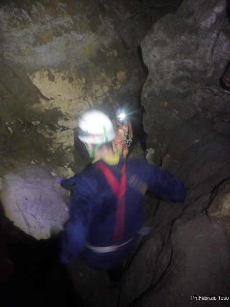 Dopo il frugale pasto tutti assieme inizio di nuovo a sentire il fresco della grotta. E’ il momento giusto per ripartire. Convinco Marta a seguirmi e insieme andiamo ad affrontare il pozzo che porta alla pozza maledetta. Mentre Marta sale faccio foto panoramiche al gruppo di sotto.