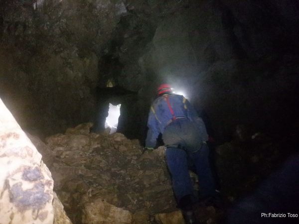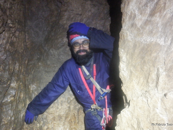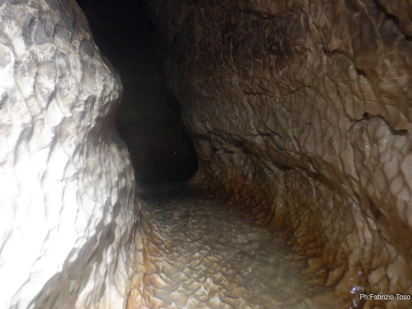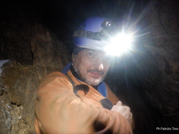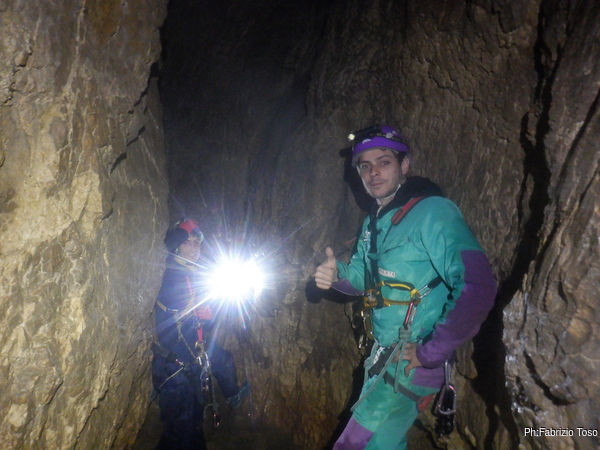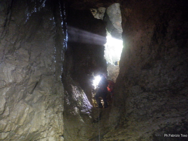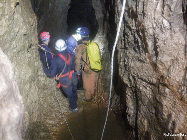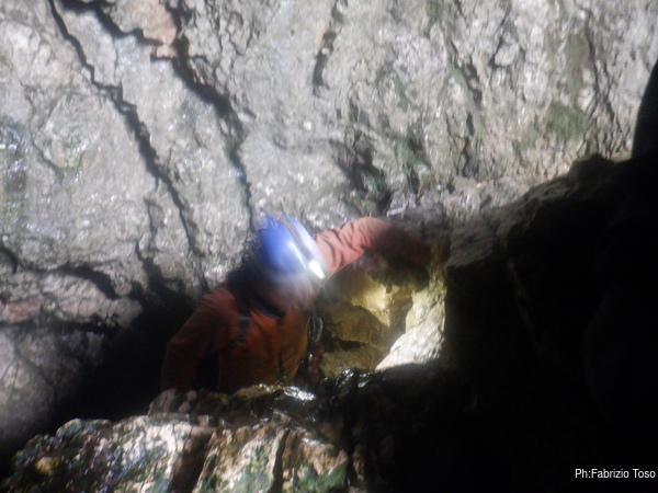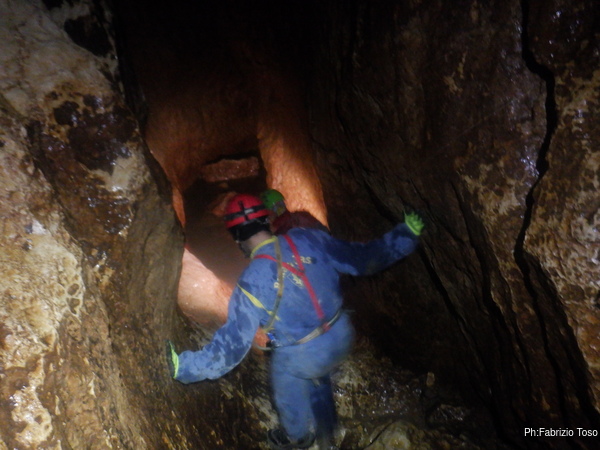 Dalla mia postazione alta riprendo chi, come Fabio, affronta impavido l’ultima pozza per raggiungere il pozzo Marilu’.