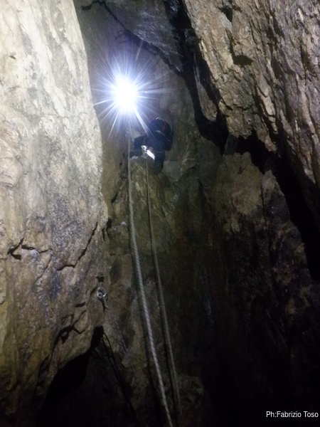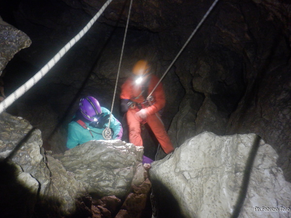 Quando da sotto arriva la libera prontamente mi fiondo ad appropriarmi di una delle due vie, quella piu’ facile, con il deviatore, e arrivo al punto intermedio del pozzo, dove c’e il restringimento prima della seconda parte della discesa. Mi metto comodo per poter fare sicura a chi scendera’.