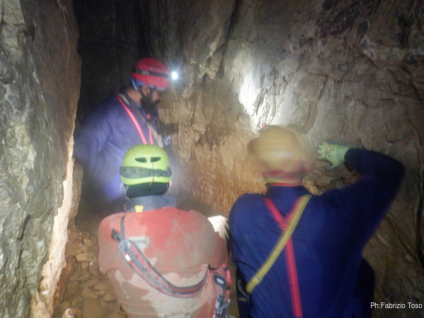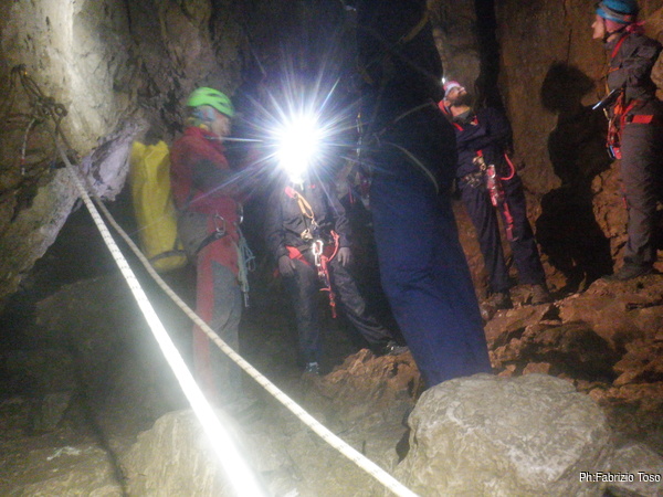 Quando ho raccolto attorno a me tre allievi mi accordo per portarli avanti. Li raduno e andiamo fino alla saletta antistante il celeberrimo quanto temuto P19. Qua troviamo i nostri armatori che sono gia’ partiti e stanno attrezzando i frazionamenti intermedi. Per oggi avremo il lusso di poter scendere in parallelo su due vie, robe di lusso.