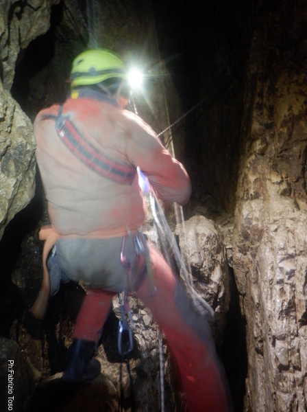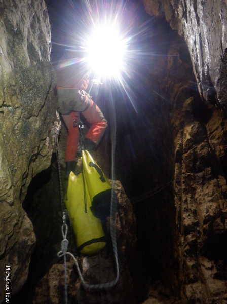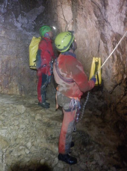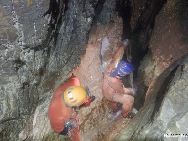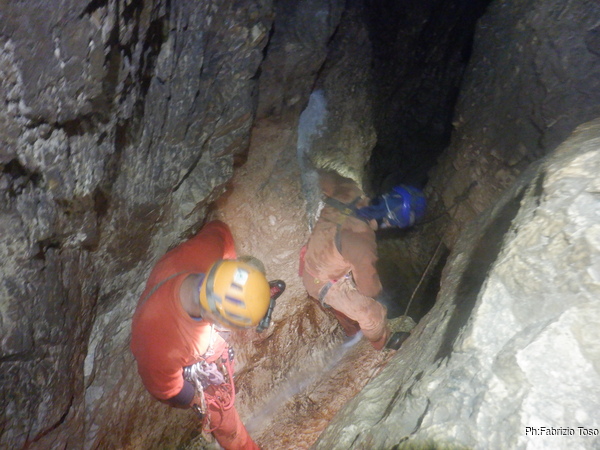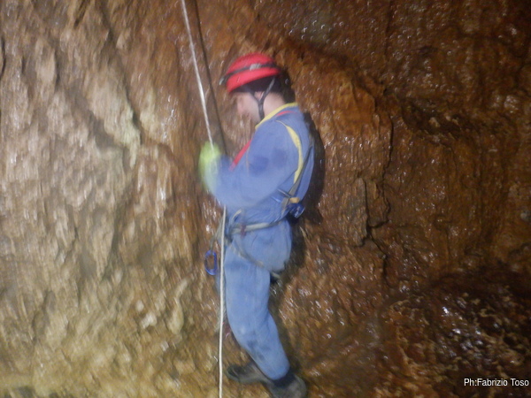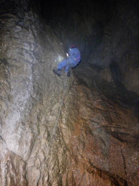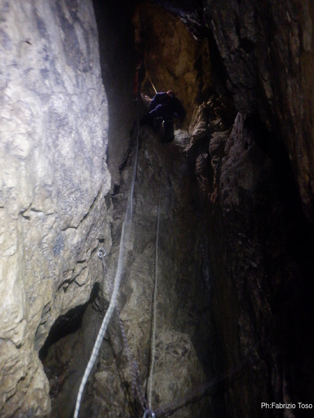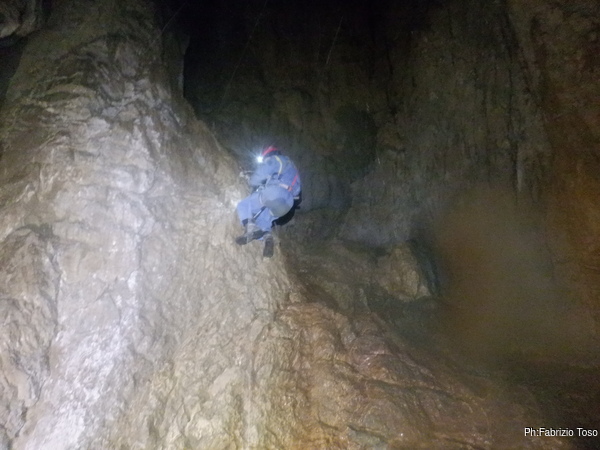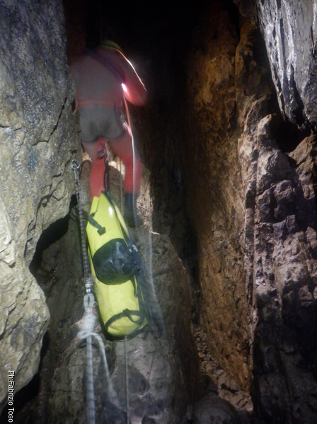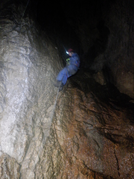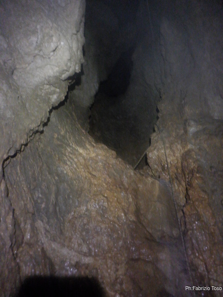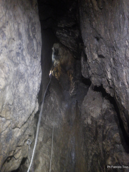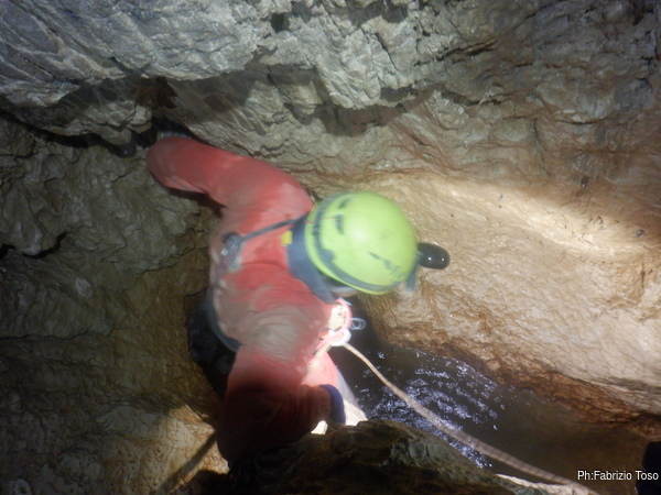Torno subito indietro, a curiosare della discesa di Dario impegnato col pozzo dopo la pozza maledetta. Per evitare l’abbondante acqua che scende proprio dalla pozza oggi i nostri armieri hanno attrezzato di lato, una soluzione che di rado ho visto utilizzata.
