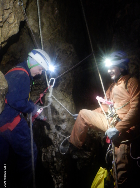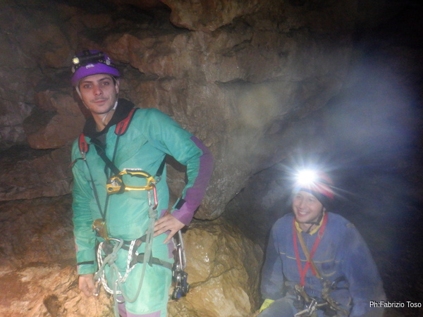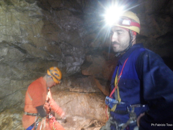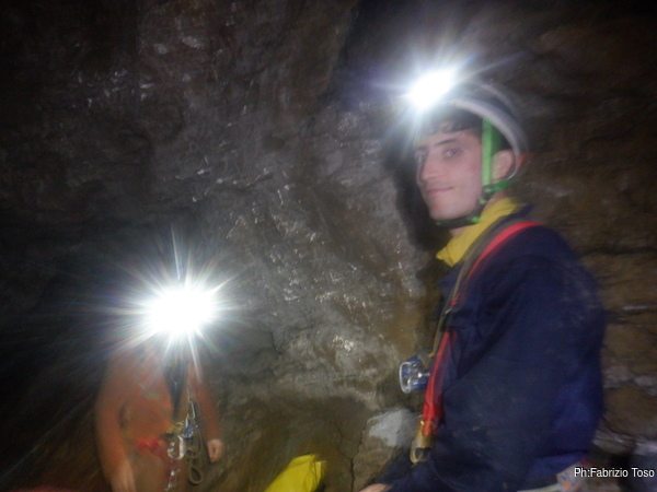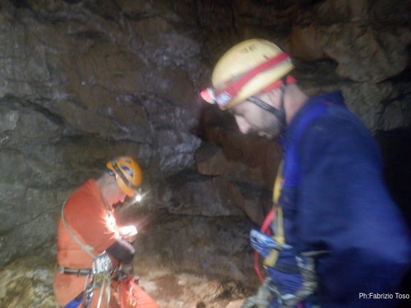 Max ha deciso che oggi fara’ un corso nel corso, infatti Alessandro ha espresso il desiderio di imparare ad armare e oggi ne fara’ una prima esperienza. Scendiamo noi tre alla sala che affaccia sul primo saltino della grotta e mentre attendiamo l’arrivo del resto del gruppo Max inizia la sua lezione di armo impartendo ad Alessandro i primi rudimenti da mettere subito in pratica.