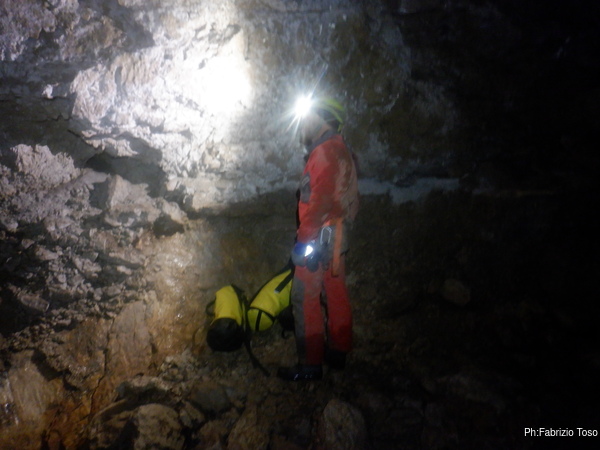 Vista l’acqua che c’e’ oggi e’ praticamente certo che non scenderemo altri pozzi, quindi faccio una rapida sosta per liberarmi dell’attrezzatura superflua prima di andare ad affacciarmi allo scivolo di fango.