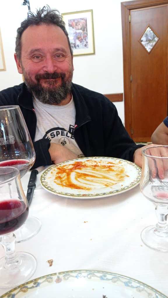In breve tempo siamo di nuovo tutti alla sala del teschio dove ci mettiamo comodi per pranzare assieme, chi con panini, chi con barrette energetiche o altro. Max si dedica alla preparazione di una tazza di brodo bollente che poi fara’ girare tra tutti i presenti. A proposito di presenti e’ da un po’ che sono arrivato alla consapevolezza di una mancanza. Tra noi non vedo piu’ la corsara Patrizia! Chiedo di lei e mi viene spiegato che il suo desiderio d’avventure ipogee si e’ infranto alla vista del P19. Insomma, non si e’ sentita di scenderlo e ha preferito tornare indietro verso l’uscita e il bel sole della giornata. Peccato, speriamo ci ripensi.
