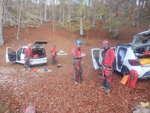 Arrivati al giorno designato siamo una squadretta di 5 persone ma di ben tre gruppi speleo. Ci sono Giulio e Alessio del GSCaiRoma, Barbara e Giuseppe del GSCaiOrvieto e io in rappresentanza dello Shaka Zulu Club Subiaco. Vista la verticalita’ della grotta siamo gia’ un buon numero, ma in zona lavori ci sara’ da fare per tutti.