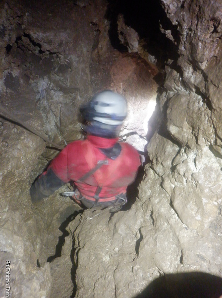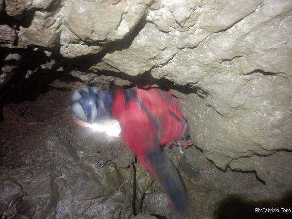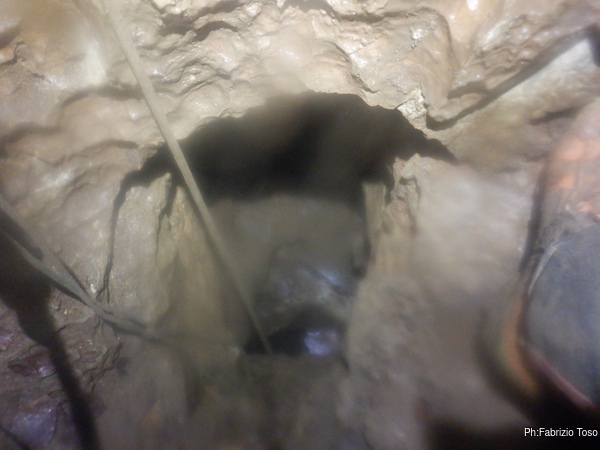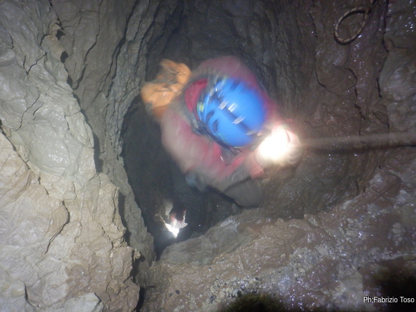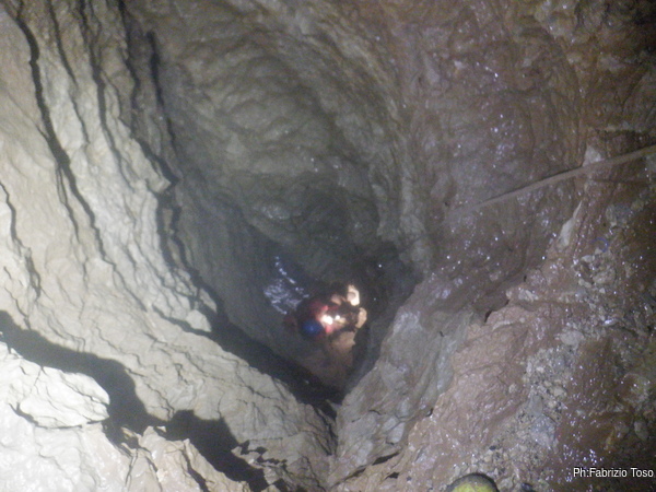 Radunate le mie cose saluto Alessio e Giulio con le ultime raccomandazioni, un sentito augurio di trovare cose belle e poi mi ficco nell’angusto pertugio che porta al pozzo. Il passaggio della strettoia mi convince che la prossima volta dovremo allargare il passaggio prima di proseguire sotto, cosi’ com’e’ ora e’ quasi punitivo!