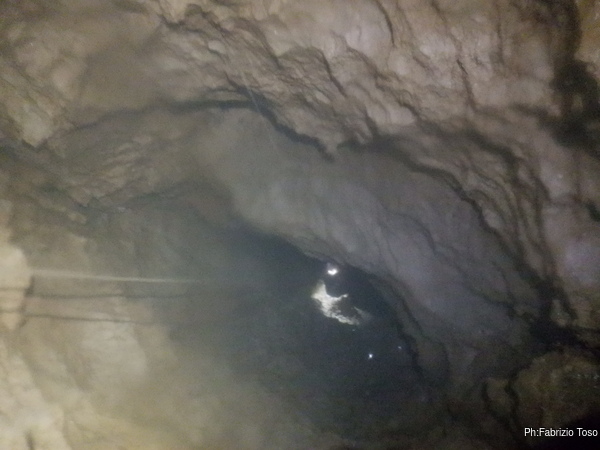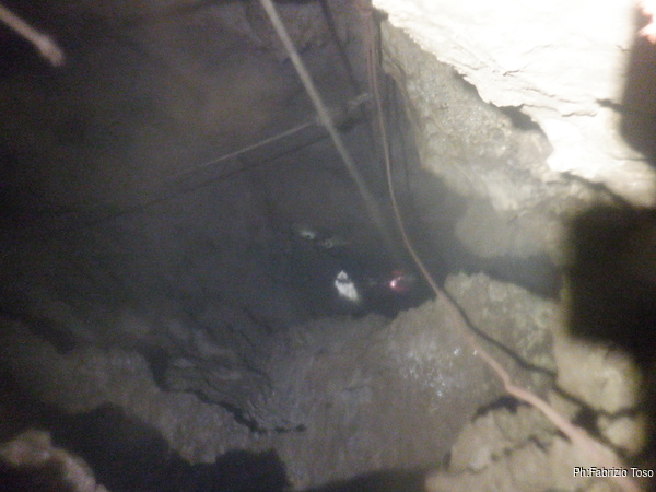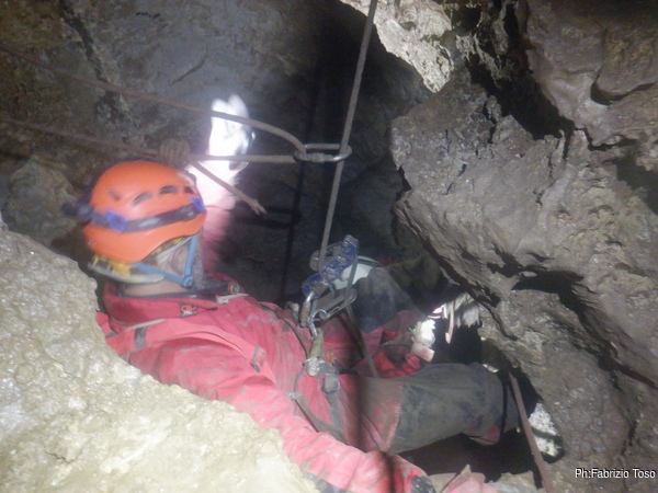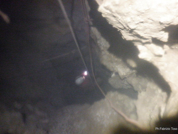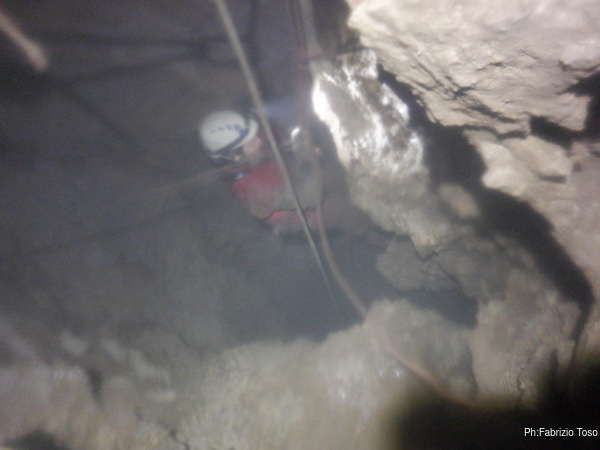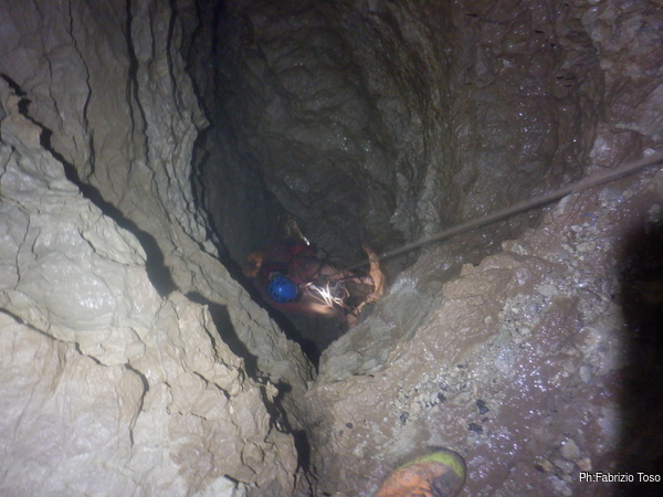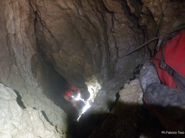 Per porre rimedio alla situazione prima che diventi pericolosa decidiamo che la cura migliore possibile al momento e’ la salita di un bel P50, che casualmente abbiamo disponibile. Avvertiamo Giuseppe che e’ ancora impegnato con la risalita e poi partiamo.
