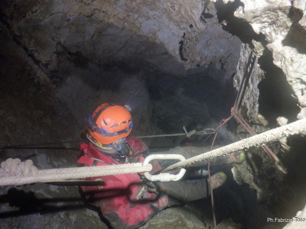 In una veloce fila indiana arriviamo alla partenza del P25. Giulio e’ gia’ sceso mentre Alessio inizia ora a impegnare la strettoia iniziale. Quando sentiamo la sua libera al primo frazionamento Barbara inizia la sua discesa.