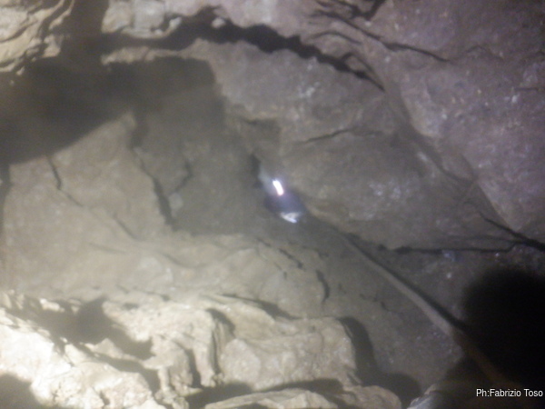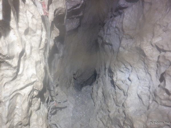 Qua anche le nostre strade si dividono. Io andro’ sul fondo del pozzo laterale a scavare per ricavare un passaggio mentre loro andranno ad affrontare la risalita cercando di arrivare in cima e vedere come prosegue. Con disappunto scopro che Alessio ha lasciato il suo zaino alla base del P50. Nel suo zaino c’era una parte della attrezzatura che mi serviva per lavorare. Il mio borbottio contrariato lo induce subito a proporsi per tornare a prenderlo pero’ nel frattempo ho verificato di avere anche altro materiale utile al mio lavoro quindi gli evito questa fatica aggiuntiva. Speriamo pero’ che questo inconveniente gli serva di “lezione”, lasciare uno zaino con materiale comune senza avvertire puo’ vanificare un’intera uscita. Stavolta si poteva rimediare ma non sempre e’ possibile.