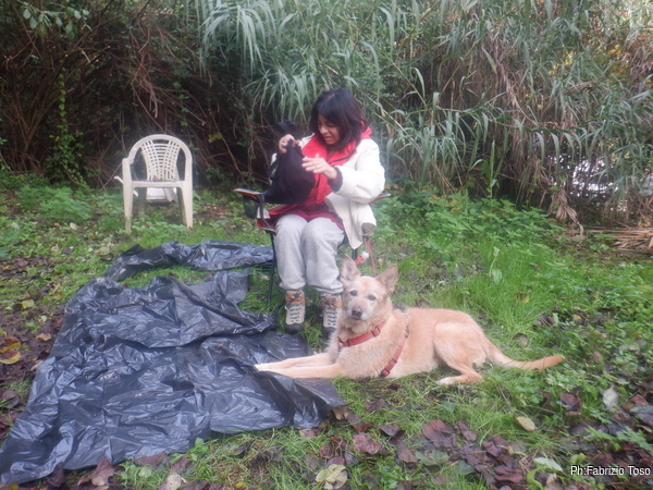 Mentre la brace per cuocere la carne va ad accumularsi il tavolino con le provviste deve essere controllato a vista da tutti perche’ abbiamo un ospite indesiderato. E’ un pastore maremmano magrissimo e molto molto affamato. Gia’ una volta si e’ fregato un intero incarto di fette di pancetta, recuperato per miracolo. Ora plachiamo le sue incursioni dandogli dei bocconi ogni tanto. Per fortuna e’ tanto mansueto quanto affamato ma altrettanto determinato ad avere la sua parte di cibo quindi nonostante i nostri sforzi per allontanarlo torna spesso alla carica.