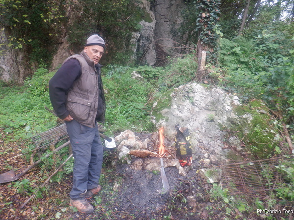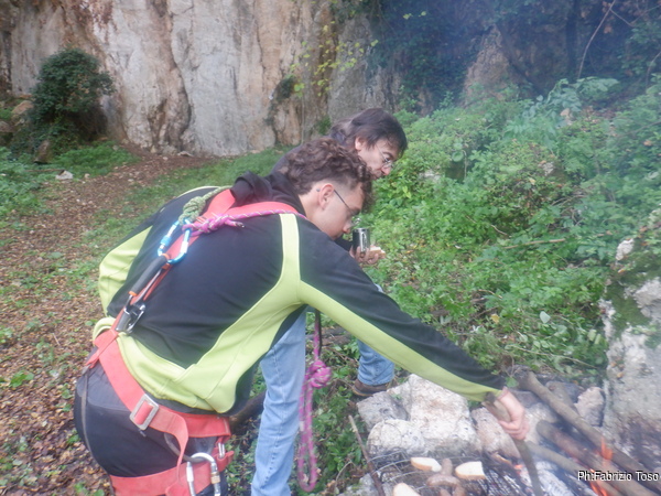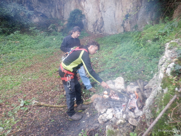 Mentre qualcuno si veste da speleo Nerone bada al pratico e accende il fuoco per fare la brace dove cuoceremo salsicce e altre leccornie.