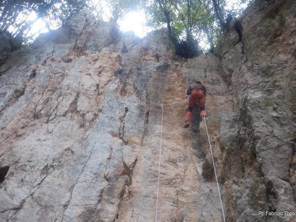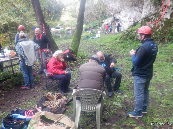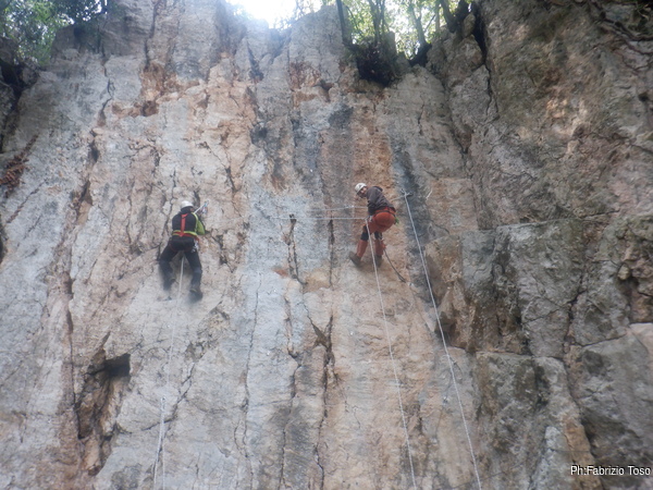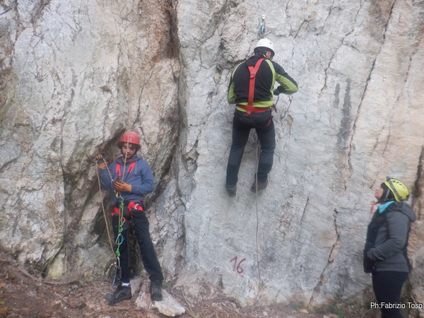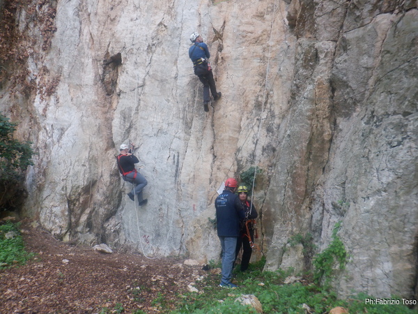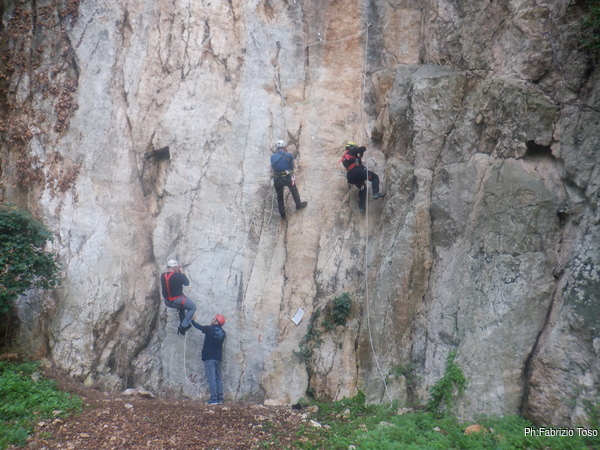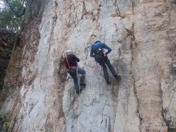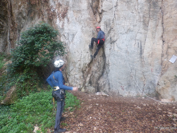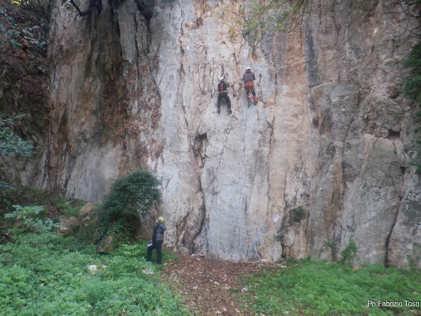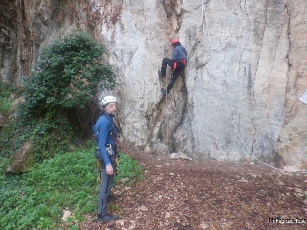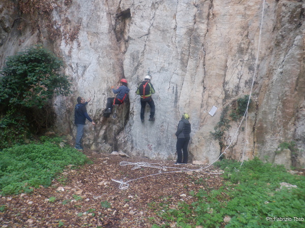 Per i suoi amici intanto mettiamo una corda su due attacchi a circa 3 metri da terra e iniziamo a farli esercitare sulle manovre base. Intanto ho imparato i loro nomi, Alessio e Vittorio. Alessio lo abbiamo gia’ portato in grotta alla Mecchia e in quella occasione e’ stato portato su e giu’ dai pozzi dal suo amico Luca. Vittorio invece e’ alle primissime armi ma in compenso arrampica quindi anche lui non e’ completamente a digiuno. Per raggiungere gli attacchi a 3 metri da terra sfrutto senza vergogna le abilita’ di Vittorio.
