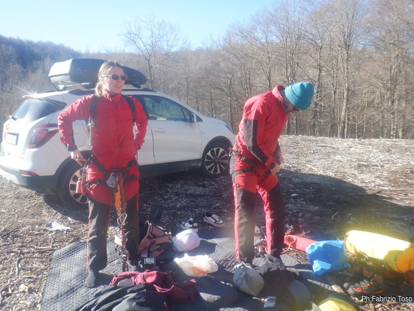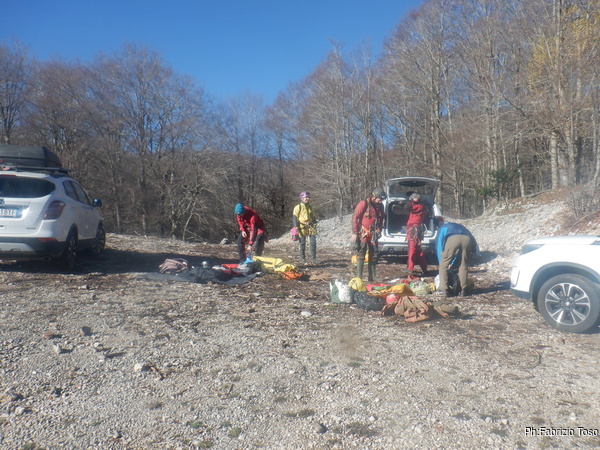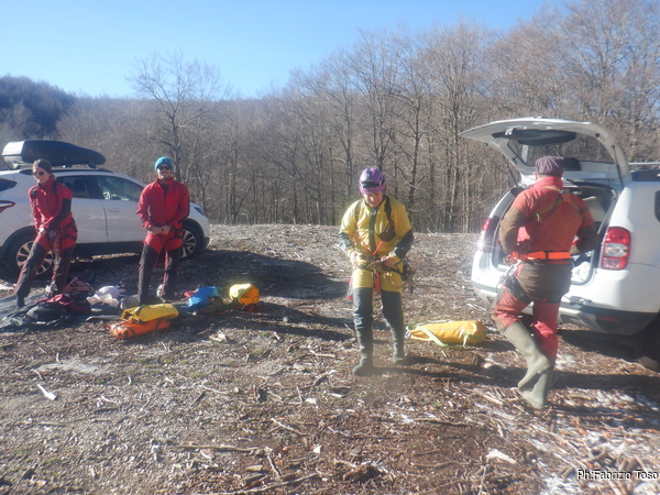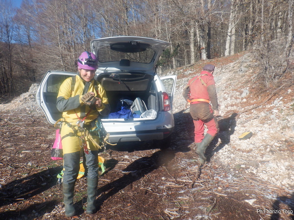 Loro faranno una sosta per dare sostegno a Nerone e recuperare il materiale, noi intanto ci avviamo alla grotta, ci piace cambiarci con calma. Arrivati affrontiamo il freddo e ci cambiamo, nel mentre arrivano anche Bibbo e Luca, ormai coppia di lavoro inseparabile, con loro anche Gabriele e nuovi amici che conosciamo proprio mentre ci cambiamo.