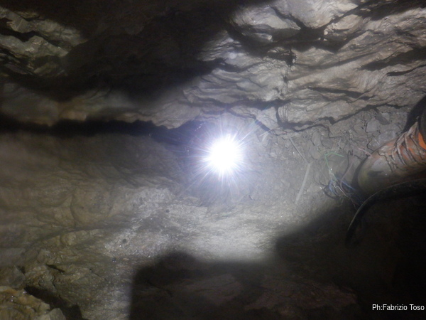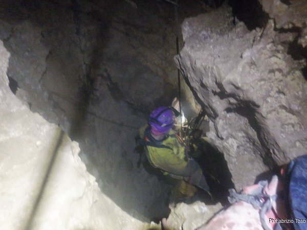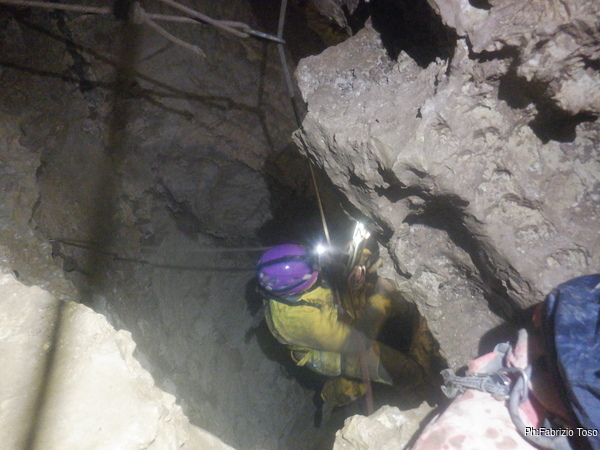 Bibbo mi avverte di una insidiosa strettoia all’imbocco del pozzo: lo ha costretto, nelle scorse puntate, a passare togliendosi l’imbrago. Essendo di corporatura simile ma avendo, lui, molta più esperienza di me, mi preparo all’idea che sarà un passaggio “divertente”.