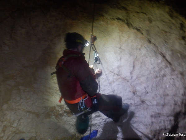 Come da prassi scendiamo il P25, il P50 e arrivati alla base di quest’ ultimo ci separiamo. Aspetto l’arrivo di Angelo e ci avviamo al nostro posto di lavoro.