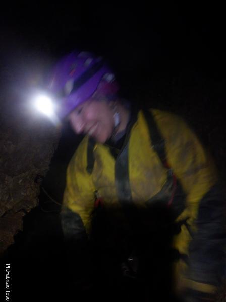 Entriamo! Questa volta sono la prima a scendere, mi fa quasi sentire la padrona di casa! Dietro di me Luciano che non è mai venuto in questa grotta, allora piano piano, come saggiamente insegnato da Bibbo, gli mostro qualche “trucchetto” per affrontare al meglio le strettoie e qualche passaggio su cui invece bisogna essere un poco più attenti per evitare di lanciare sassi a quelli sotto di noi.. meno male che io sono la prima!