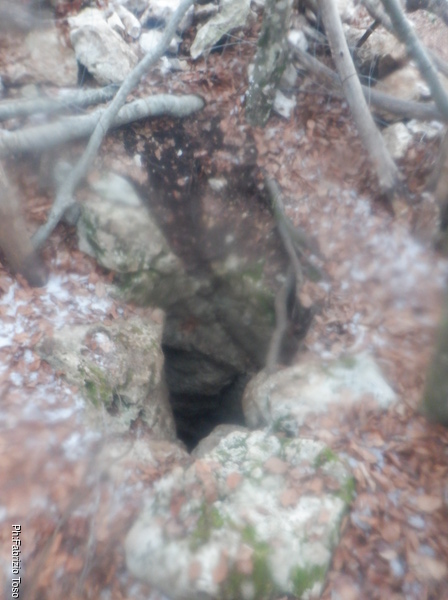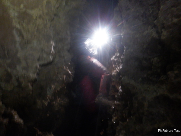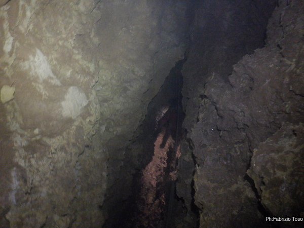 Sulla sommità del pozzo cerco il passaggio che mi avevano indicato e del quale mi erano state mostrate delle foto. Lo trovo: una crepa, laterale al di sotto del pozzo non più larga di una spanna nei suoi primi 30-40cm di sviluppo, che continua allargandosi a dimensioni quasi umane per zigzagare via nel buio dopo un paio di metri, lasciando supporre che oltre ci sia un altro piccolo ambiente.