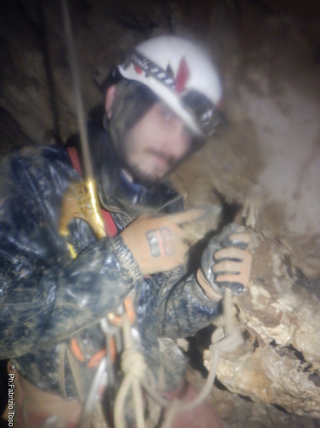 Con poca sorpresa accettiamo che il pozzo sia percorso da un pesante stillicidio: la discesa sarà almeno umida e la risalita sarà più che bagnata. Nei nostri discensori si alternano i frazionamenti ed i deviatori del pozzo e, quando tutti e 4 siamo “piedi a terra”, ci salutiamo per andare alle nostre aree di lavoro.