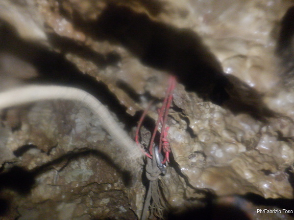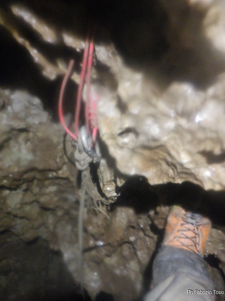 Dalla cima del P50 arriva il libera. Delle due linee di salita, per motivi affettivi scelgo quella sotto lo stillicidio – non che l’altra fosse di molto più asciutta – e vengo premiato con la rottura improvvisa, con un botto clamoroso, del laccio che regge il croll.