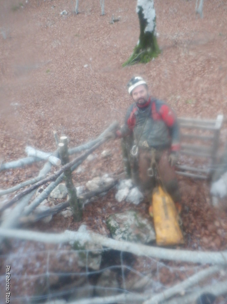 Raccogliamo la poca “monnezza” prodotta, riprendiamo gli attrezzi. Sistemiamo alla meno peggio tutto quel che entra nello zaino e il resto, sostanzialmente l’enorme telo che avevamo messo a protezione, lo portiamo su legato alla corda. Mentre Luca sale io disarmo i due attacchi di stazionamento che avevamo messo ad inizio lavori. Quando Luca urla la libera, salgo anche io. Vicino all’uscita passo a Luca la corda e gli faccio tirare su il telo legato in fondo, quindi esco a mia volta, non senza aver disarmato il deviatore. Come saluto di commiato smonto anche le due placchette di partenza e ammatasso la corda che sara’ sicuramente utile per altro.