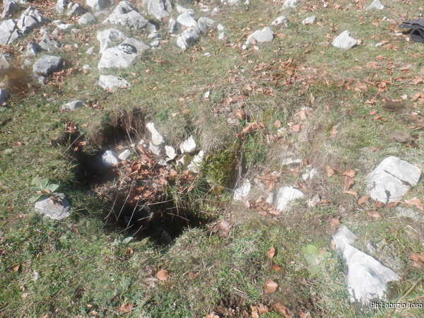 Cammina cammina arrivo nel punto dove ricordo di essere passato tempo fa (un paio d’anni?) durante una passeggiata con Alessia, Luca e Corrado. Passiamo accanto al buco che avevamo erroneamente scambiato per Pozzo Pasqualitti e proseguiamo fino a trovare il vero ingresso. A dire il vero questo buco lo aveva trovato Alessia anche al tempo della nostra passeggiata ma non ci era sembrato degno di nota…mai sottovalutare una depressione nel terreno da queste parti!