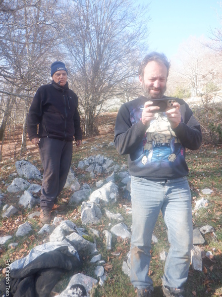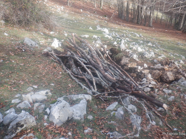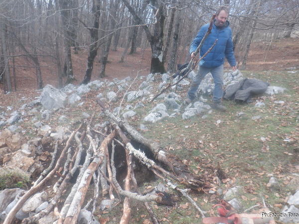Aggiorno per bene i miei amici poi propongo un’ultima fatica, l’ulteriore allargamento dell’ingresso. La proposta viene accolta e sbrighiamo la faccenda in pochi minuti. Subito dopo iniziamo la raccolta di rami (“filagne” in sublacense) per coprire l’ingresso e fare in maniera che gli animali al pascolo evitino di caderci dentro…e anche per evitare che pastori prudenti possano decidere di chiudere di nuovo la grotta.