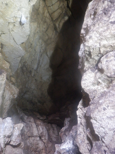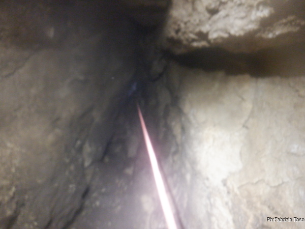A un metro dall’ingresso trovo una bella sorpresa, una spaccatura laterale sembra portare ad un pozzo parallelo. Alla prova del sasso sembra profondo almeno come quello gia’ sceso. Cerco di dargli una allargata col mio fido martello ma ben poco riesco a fare. Anche affacciarmi sulla verticale del pozzo risulta difficile quindi mi astengo. E’ sicuramente interessante perche’ l’aria sembra uscire da la’. Per ora mi limito a fare una foto all’imboccatura del pozzo. Lo ispezioneremo la prossima volta.