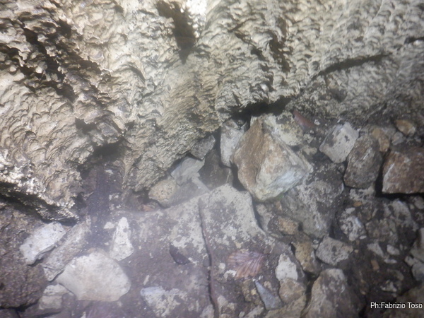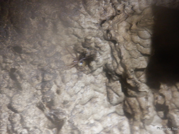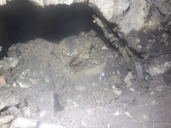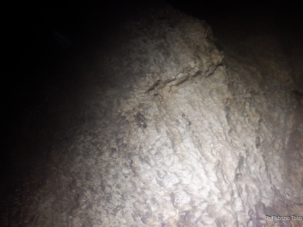 Alla base del pozzo un piccolo cono di terra fresco fresco, tutta roba caduta durante il nostro scavo. Il resto del piano e’ ingombro di sassi sia caduti ora che nei tempi andati. Sulla parete trovo un simpatico ragnetto che cerco di fotografare mentre lui scappa precipitosamente dalla mia luce.