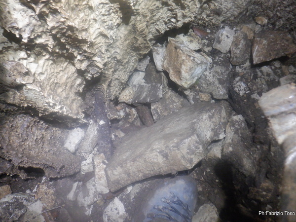 Mentre sono li’ sconsolato a guardare il cumulo di sassi e terra che dovremmo tirare fuori per verificare l’esistenza di una prosecuzione sento qualcosa cadermi addosso. Con le imprecazioni adeguate al caso mi rivolgo ai miei amici fuori per raccomandare loro, con parole fiorite, di fare attenzione a non tirarmi roba da sopra. Mi risponde la vocina di Gabriele spiegando che mentre tentava di fare il rilievo col Lidar del suo fantastico cellulare gli sono caduti gli occhiali. Sono loro ad essermi caduti addosso, causandomi piu’ spavento che danno. Guardo in giro nel paio di metri quadri che sono la base del pozzo e in effetti trovo gli occhiali di Gabriele. Manca una lente. Guardo ancora con maggiore attenzione ma trovo nulla. Ripongo quel che resta degli occhiali nel taschino per riportarli al proprietario.