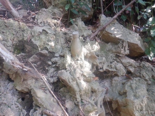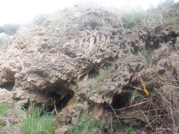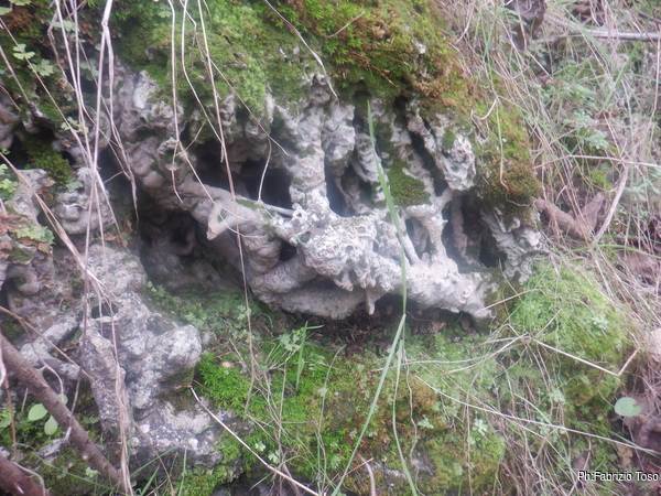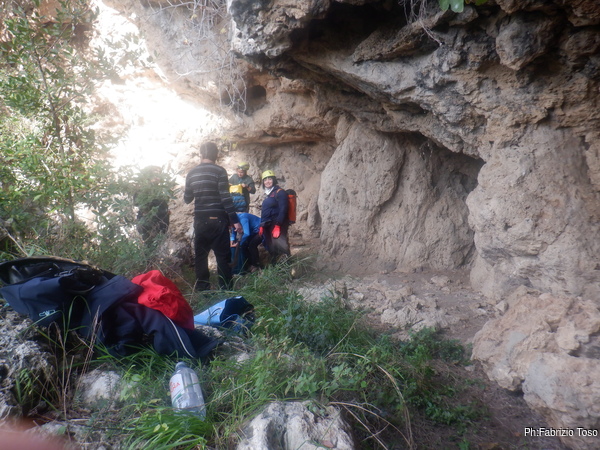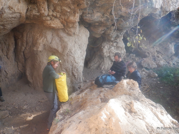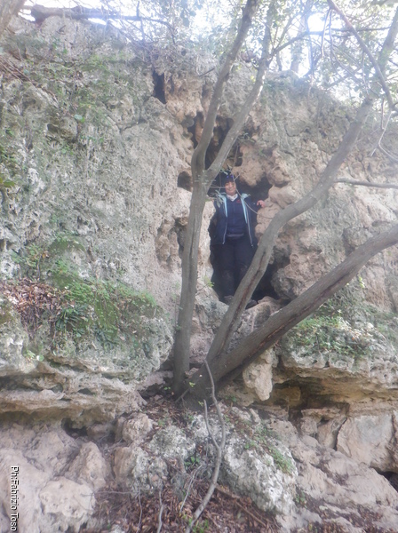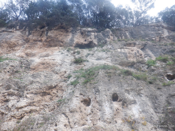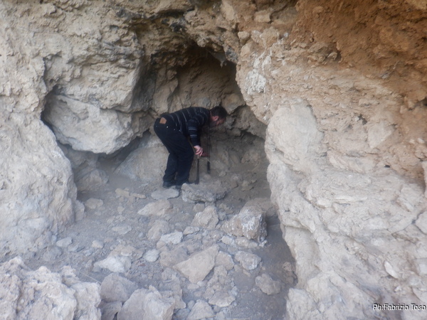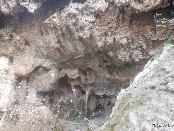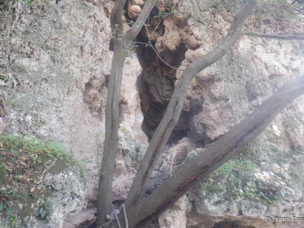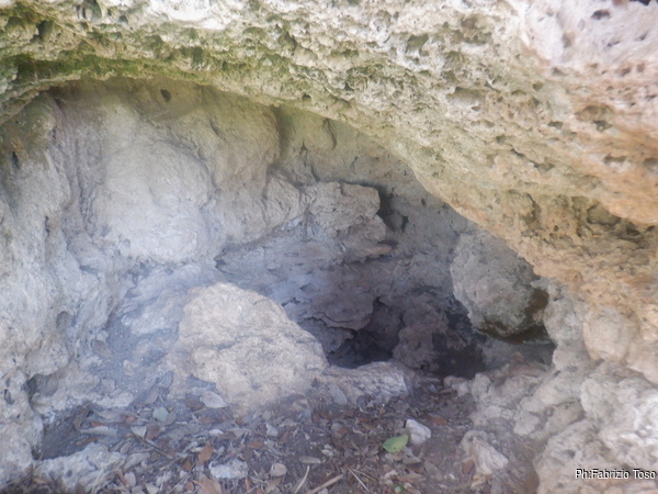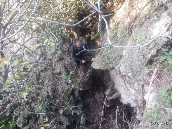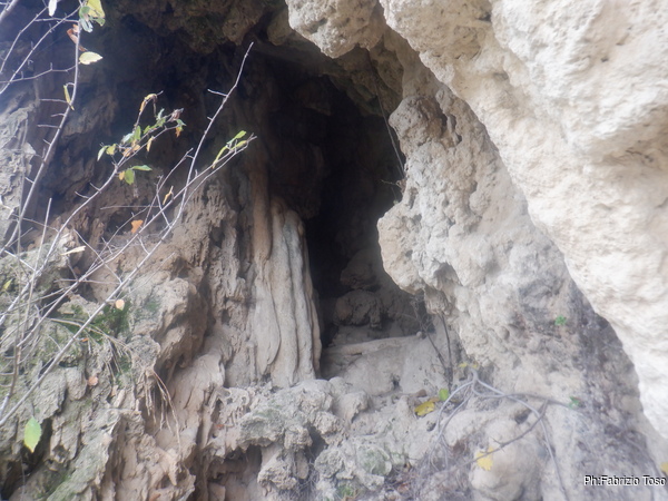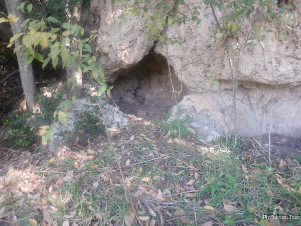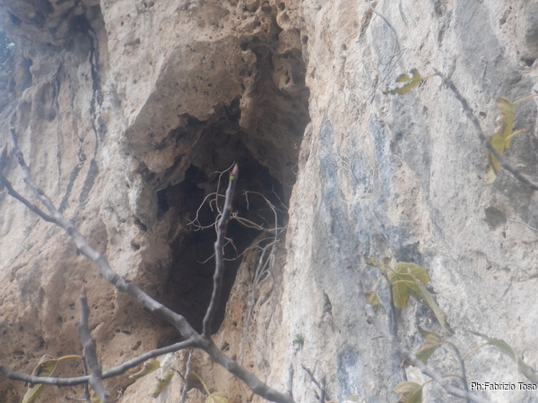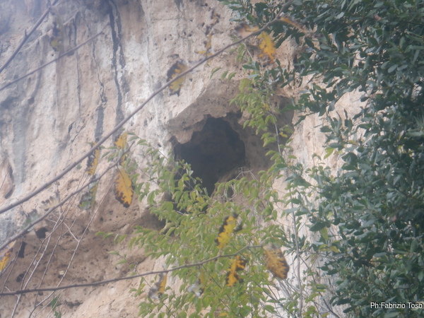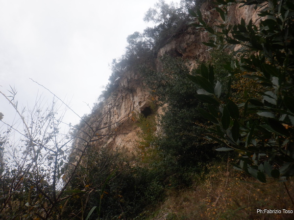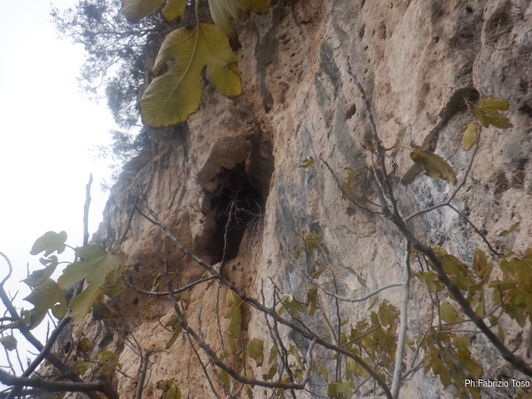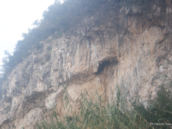 Poco dopo il muretto c’e’ un punto in cui e’ possibile scendere alla base della parete. Troviamo subito una delle grotte da ricercare, le faccio qualche foto anche se non ne registro il nome.