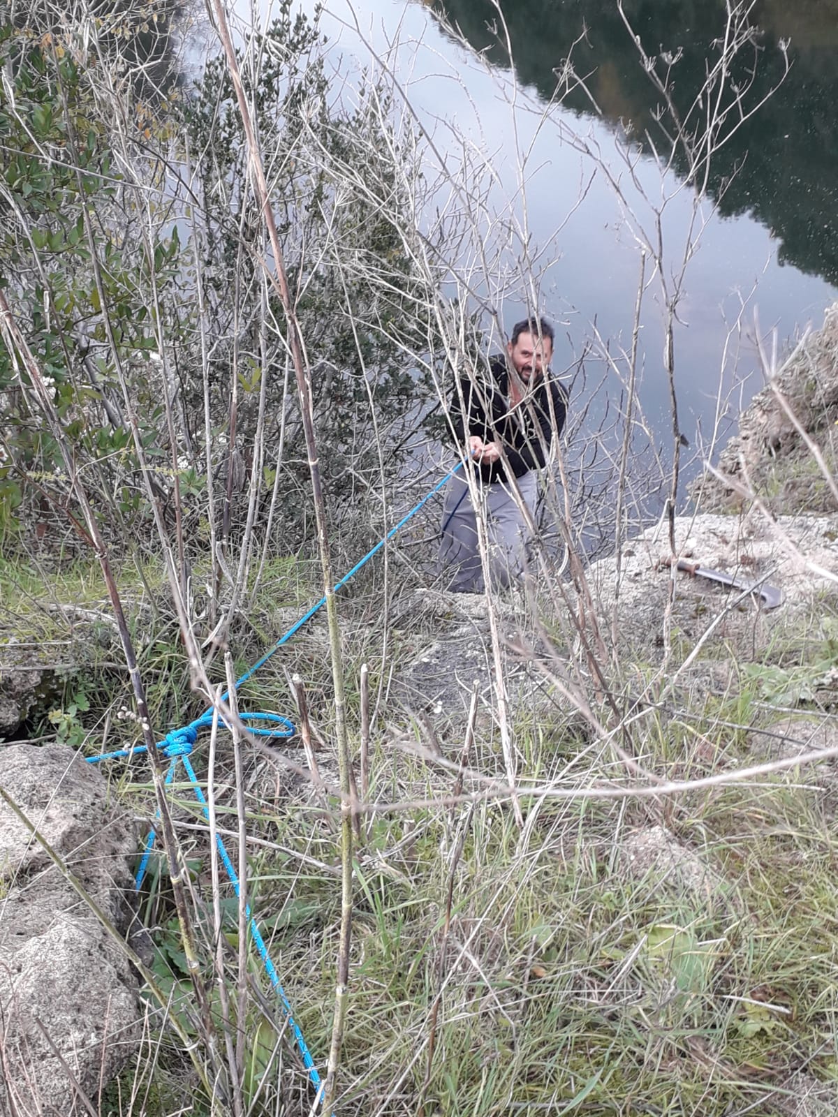 Ritorniamo su, smontiamo la corda e ci spostiamo piu’ in la’ a cercare un punto dove scendere. Lo trovo quasi subito e anche se non e’ comodissimo riesco a tornare a livello del fiume.