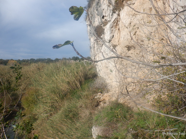 Dopo un breve tratto sulla sterrata prendiamo un sentiero in discesa che ci porta all’inizio di un’ampia spianata bordata a destra da una parete in travertino e a sinistra da un bosco di querce, davanti a noi si intuisce il fiume Fiora. La parete gia’ dall’inizio sembra promettere bene.