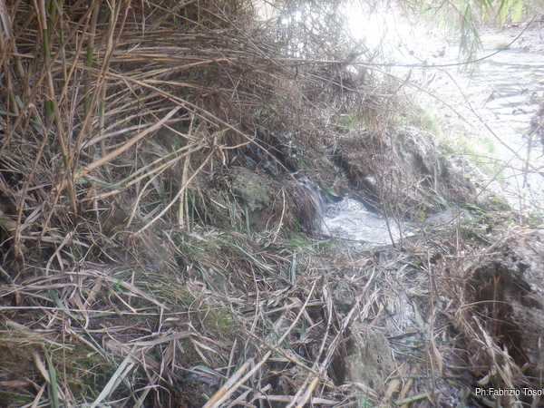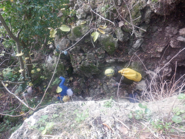 Arrivati in prossimita’ del buco in parete la vegetazione inizia a mostrarsi ostile, vado avanti tra canne e rovi e ben presto mi accorgo di essere rimasto solo. Maria ha abbandonato la tenzone e Federica e’ tornata indietro a tenerle compagnia.