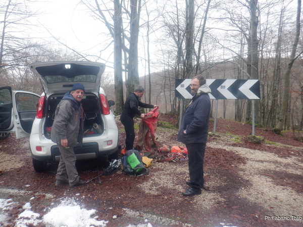 La mattina arriviamo sperando in una temperatura ghiacciata per poter sperare in un po’ meno acqua nella grotta. Purtroppo quando arriviamo al parcheggio troviamo che i 10 cm di neve raccontatici da Nerone nei giorni scorsi sono solo un ricordo, pessimo indizio. Ma Giuseppe ed io, sprezzanti della situazione avversa iniziamo a prepararci.