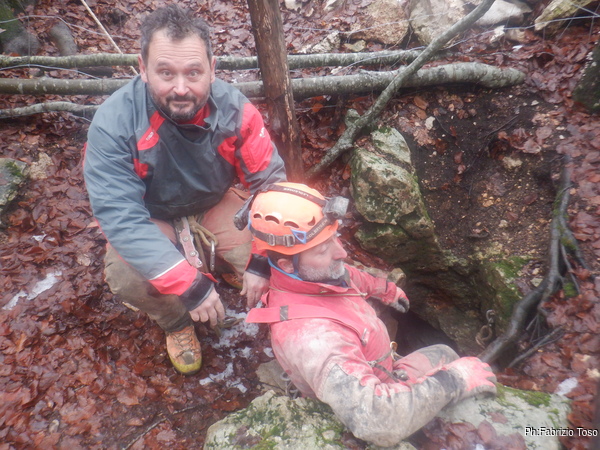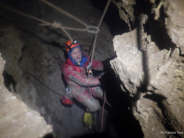 Con Giuseppe a prendere una bagnata epica. All’esterno Fabrizio e Gabriele per manovrare gli strumenti “radiologici” inventati da Fabrizio per individuare il secondo ingresso della grotta.