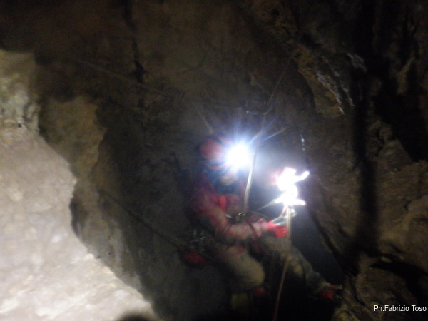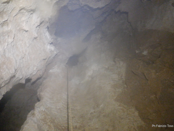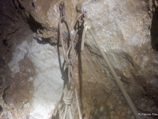 A meta’ pozzo mi urla la libera, l’ho avvertito di fermarsi perche’ altrimenti potrebbe avere una brutta sorpresa, la corda che si interrompe a 5 metri dalla base! Appena arrivo tiro fuori la corda portata per sostituire quella lesionata e armeggio per sistemarla. Quando il risultato mi soddisfa lascio il passo a Giuseppe per proseguire. In corrispondenza dello sperone di roccia che ha lesionato la corda mi fermo a sistemare meglio il deviatore aggiuntivo messo la volta scorsa. Lo osservo terminando la discesa, ora mi sembra vada bene, la corda non tocca piu’.
