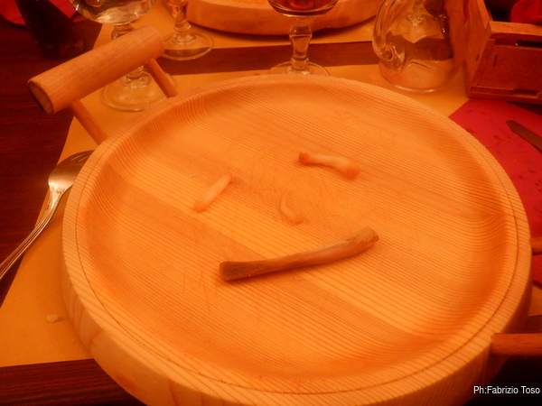 Facciamo onore a quanto ci portano chiacchierando della giornata appena trascorsa e dei prossimi esperimenti “radiologici”. La fame e’ tanta e questo e’ quanto rimane della polenta e le spuntature dopo qualche minuto.