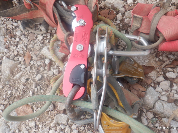 Tempo nemmeno venti minuti e i nostri eroi sono di ritorno con tutto il necessario. Saggio la roccia e trovo dove piantare il fix. Sistemato l’attacco armo il deviatore e siamo pronti per iniziare finalmente la nostra visita.