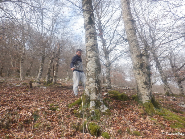 Mentre recupero il fiato inizio a imperversare sui miei amici. Tiro fuori la corda che useremo per il primo pozzo e spedisco Luca all’albero che sovrasta l’ingresso della grotta perche’ lo utilizzi come partenza per l’armo.