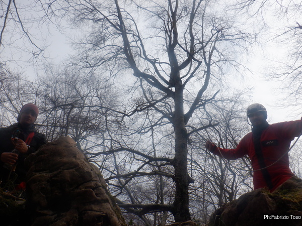 Io non ce la farei a sostenere un’altra salita come quella appena fatta, dopo tutto, cerco di consolarmi, sono ancora convalescente da influenza+bronchite. Mentre li aspetto torturo una radice di belle dimensioni per farci passare sotto un cordino. In ogni caso un deviatore alternativo lo ricavo.