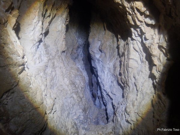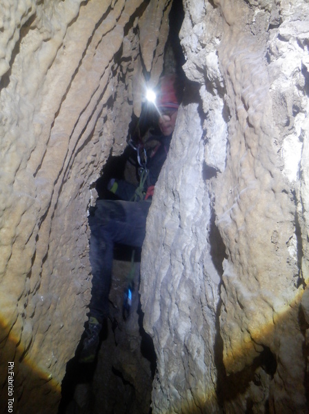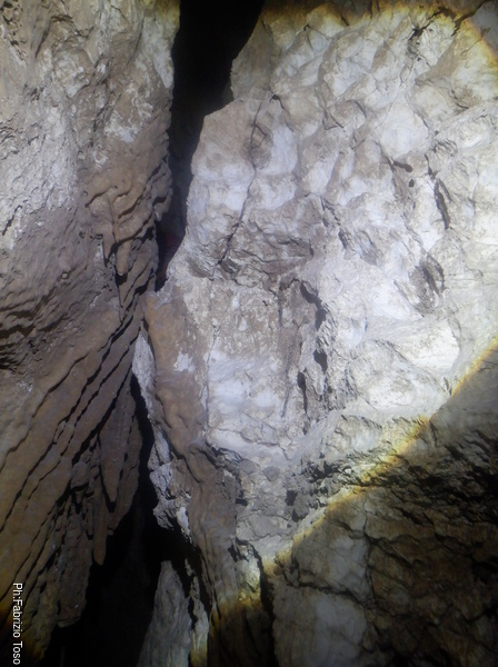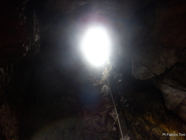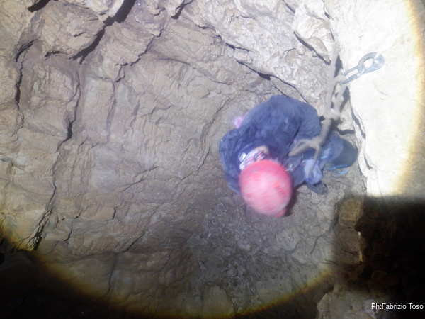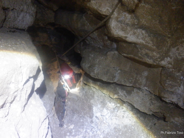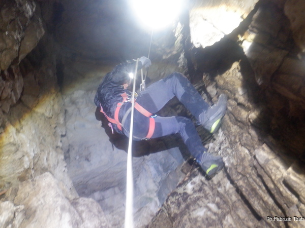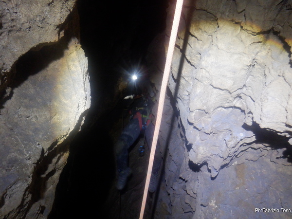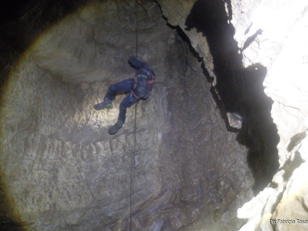Messa la corda vado a cercare come mettere il deviatore a livello ingresso che evita alla corda di strusciare troppo. Mi accorgo solo ora che l’armo del deviatore e’ su spit…serve un bullone. Una rapida verifica con Luca ci permette di accertare che non ne abbiamo. Ma nessuna paura, i miei amici sono giovani e forti, subito si offrono di riscendere all’auto per recuperare trapano e fix per ovviare.