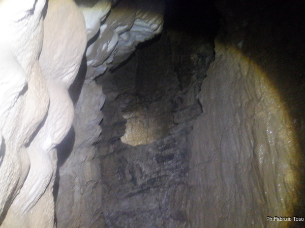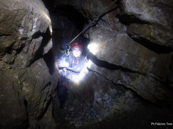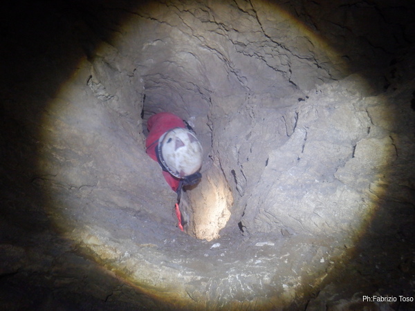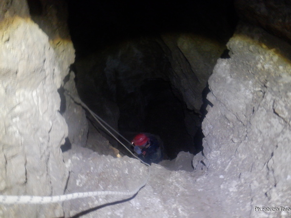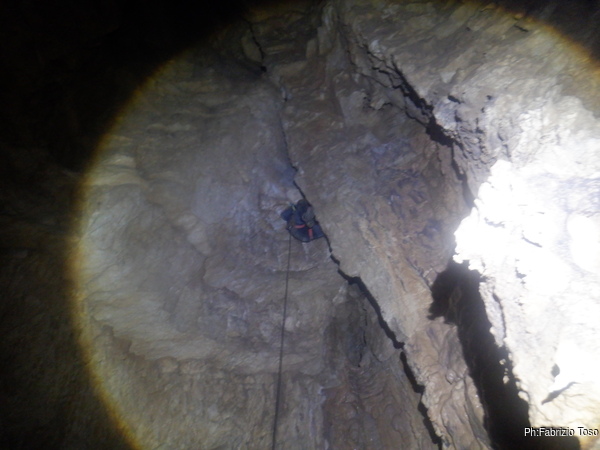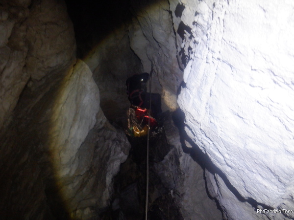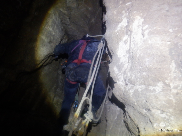Arrivato Alessio aspetto che anche Luca parta poi affronto il secondo pozzo, o meglio la prosecuzione del primo. La partenza non e’ agevolissima quindi mi perdo in raccomandazioni per Alessio. In fondo al pozzo cerco un punto con meno stillicidio possibile e attendo che arrivino i miei amici.