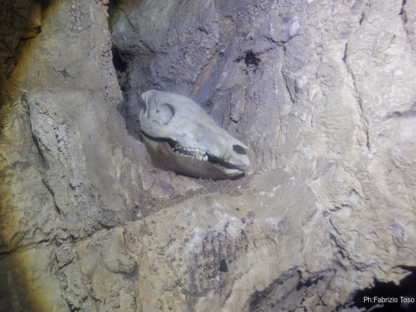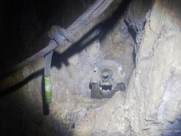 Alla partenza del pozzo successivo c’e’ il teschio che e’ messo come guardiano della grotta. Nella mia ignoranza abissale ho stimato possa essere il teschio di una faina, a cui si deve il nome della grotta.