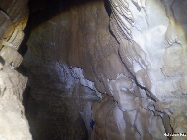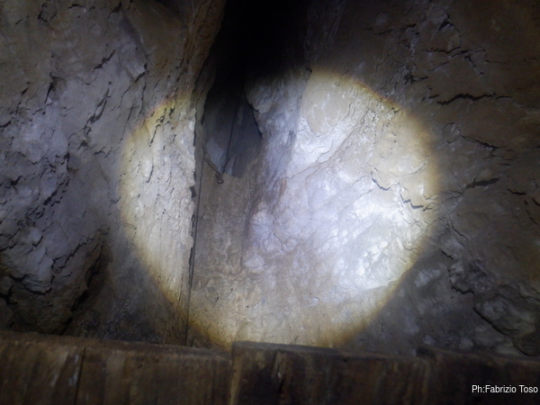 Andiamo avanti in fila indiana per i pozzi successivi. Qua sono dietro la pedana di legno messa a protezione dei sassi che arrivano dall’alto. La prudenza non e’ mai troppa ma devo dire che la discesa di Alessio provoca la caduta di solo un paio di sassolini.