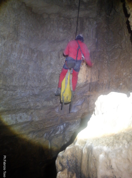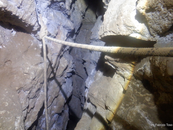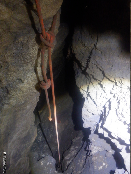 La corda che scende alla base del meandro poi risale fino a 4 o 5 metri di altezza dove c’e’ un altro passaggio possibile.