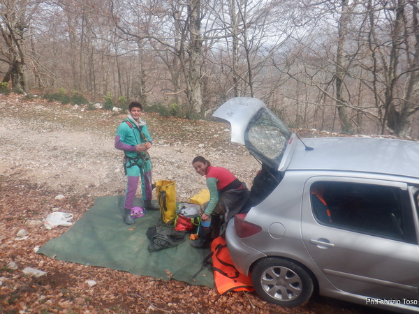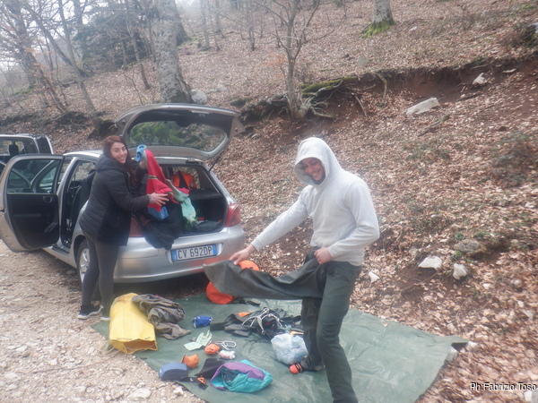 Dopo i saluti ci compattiamo per muovere meno auto possibili e andiamo al parcheggio vicino la grotta. Senza troppa fretta iniziamo a prepararci. Alice e Alessandro prima e dopo la vestizione.