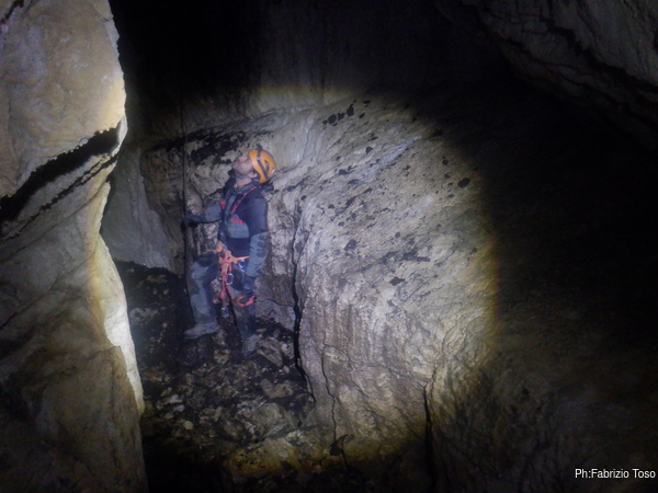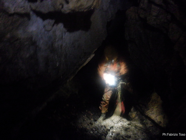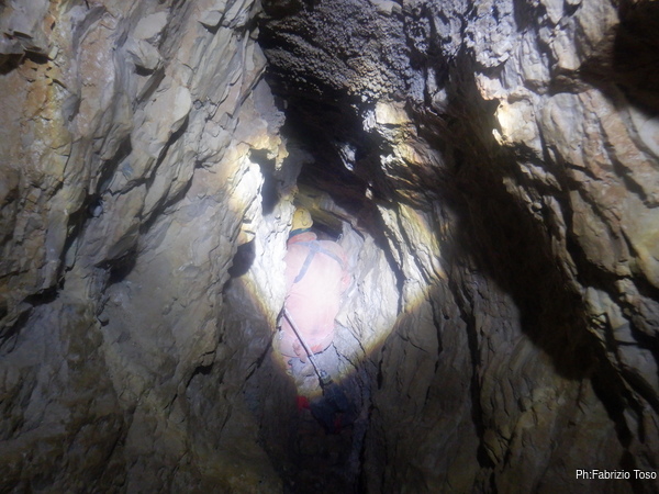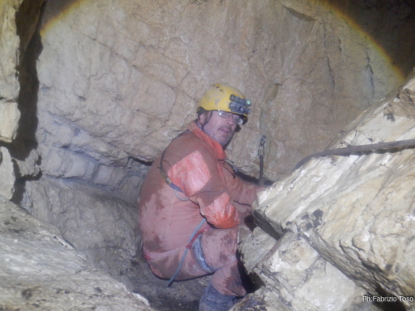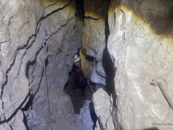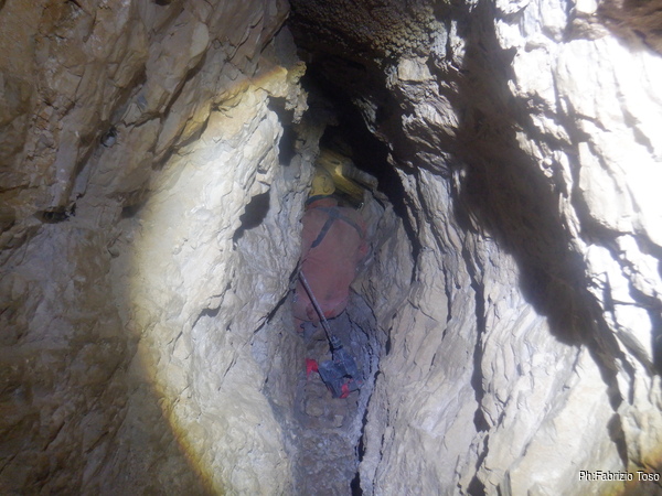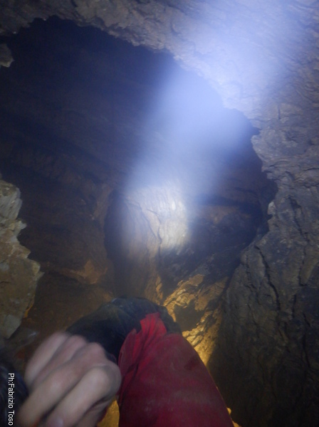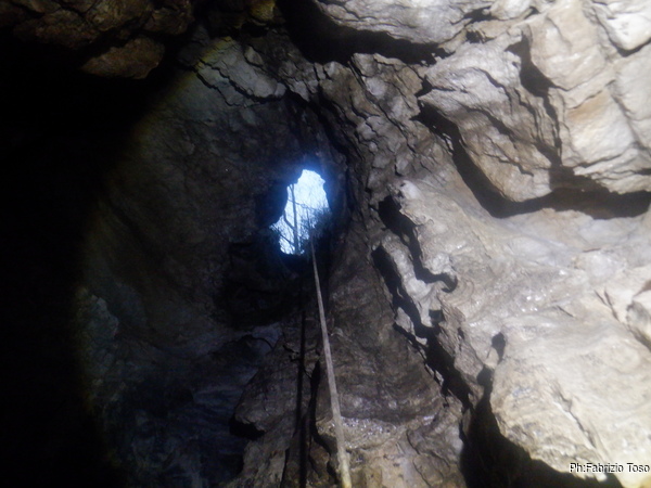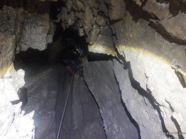 Fabio intanto arriva alla base dell’ultimo pozzo. Gli diciamo di aspettarci per evitare che caschino altri sassi ma forse non ci sente perche’ non si ferma e sale verso l’esterno, per fortuna senza altri inconvenienti.